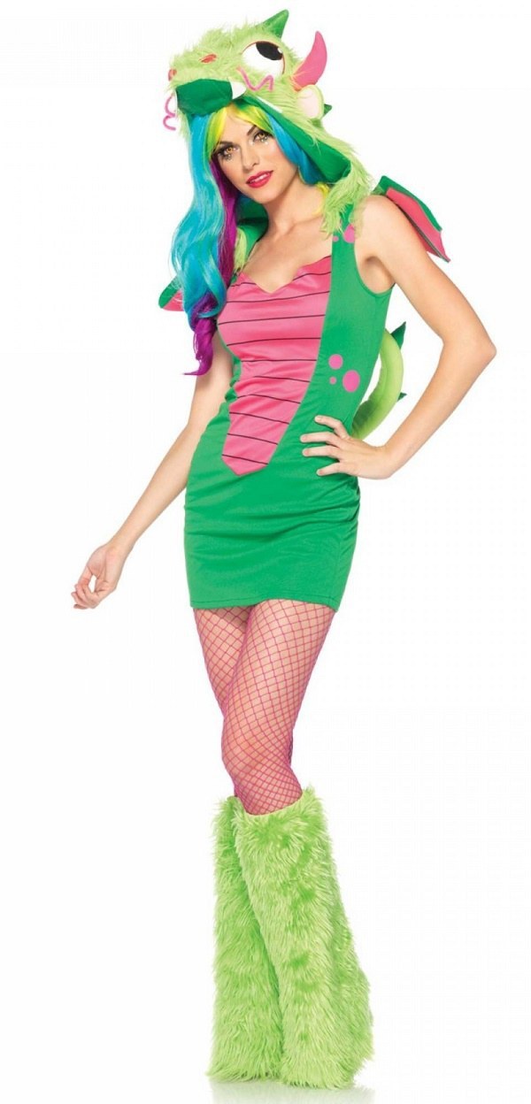 Magic Dragon Costume includes a dress with an attached tail. The dress also Features a pair of attached wings and a dragon hood.