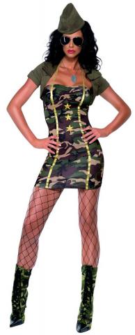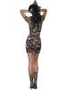 Fever Major Trouble Costume includes a camouflage army style dress with gold star detailing and khaki green short sleeved shrug. To complete this military look a co ordination army hat is also included.