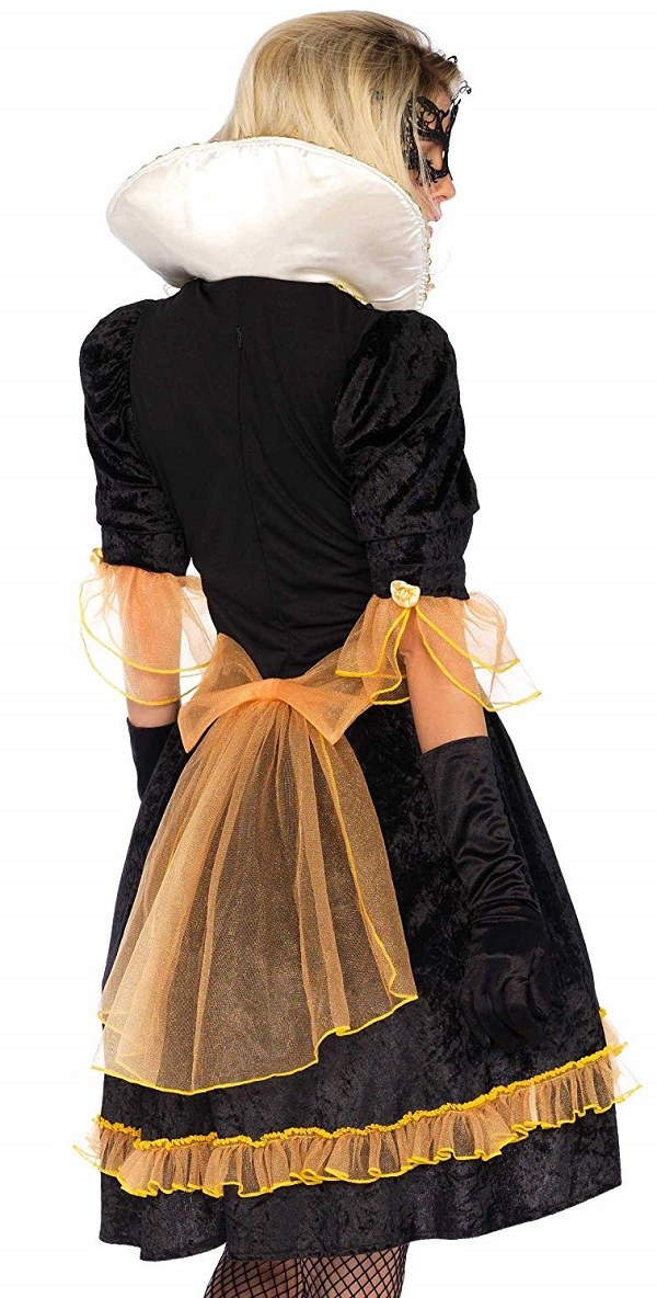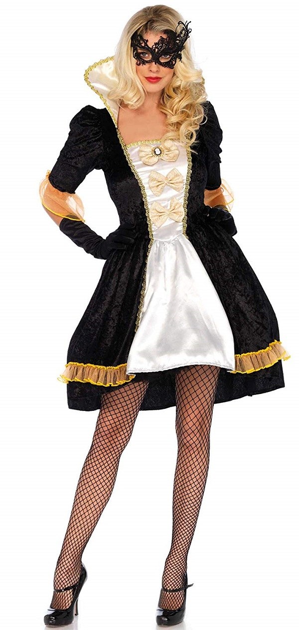 Masquerade Marie Antoinette Costume includes a dress with bow detail and a stand up collar. To complete the look the black mask is also included.