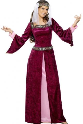 The Medieval Maid Marion costume consists of a burgundy velour dress with detailing around the neckline and waist and pink underlay. Matching head piece with two side veils also included.