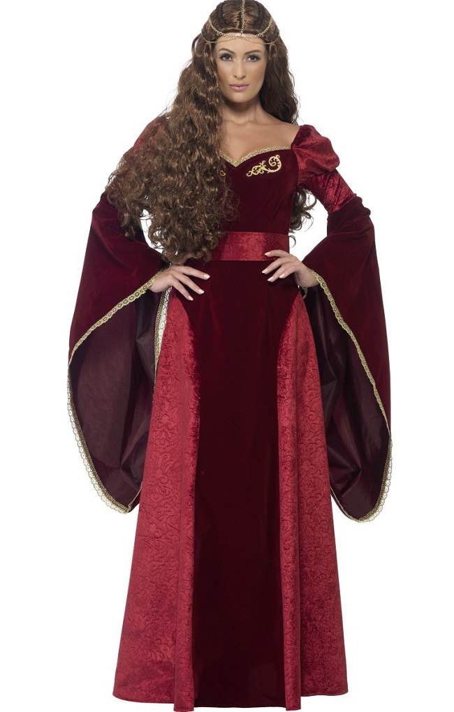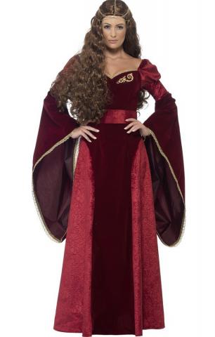 Deluxe Medieval Queen costume includes a long burgundy velour dress with flowing sleeves and a belt. To complete the look a Queen headpiece is also included.