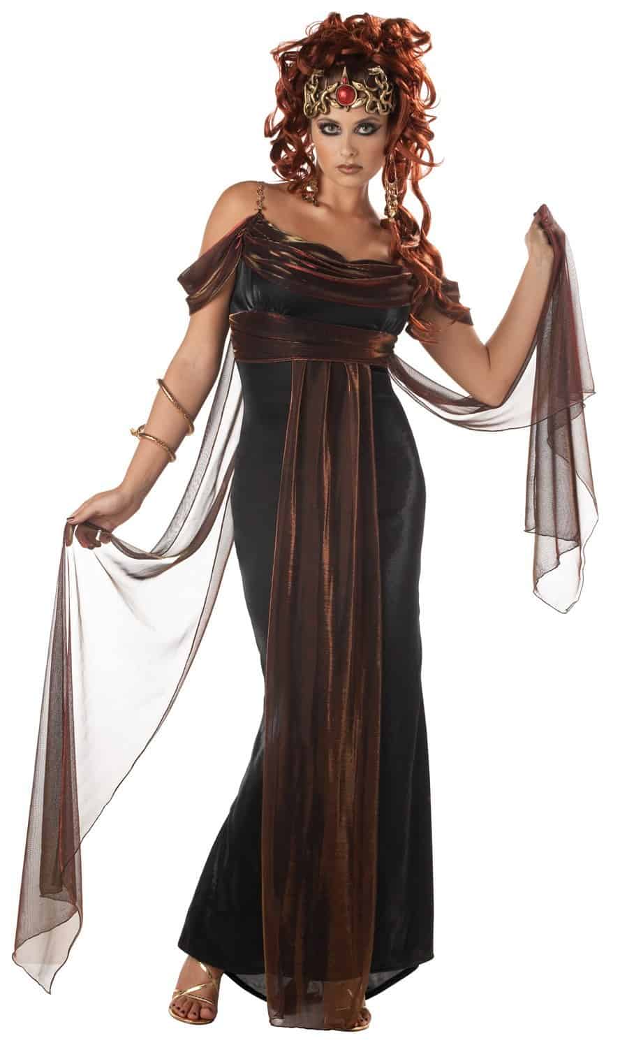 Medusa Mythical Siren Costume consists of a stunning long black off the shoulder dress with attached gold drape and a snake design headpiece.