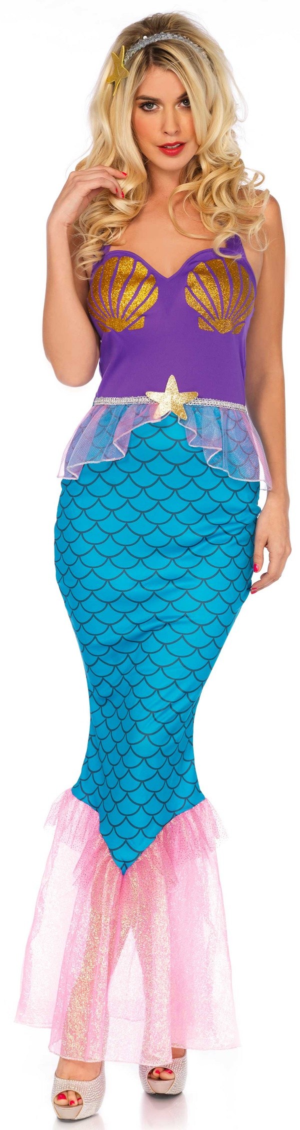 Plunge into the depths of the ocean with our Darling Mermaid Costume. Included in this costume is a dress with blue fish scale and pink glitter bottom. The top of the dress is purple in colour and features printed gold seashells.