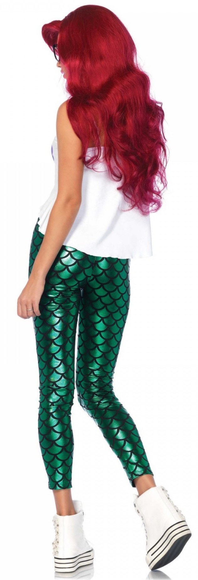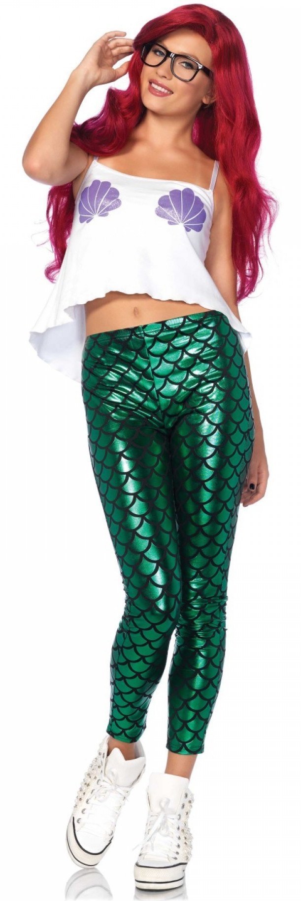 Mermaid Hipster Costume includes a glitter shell white crop top and a pair of green leggings with scale print. To complete the look a pair of faux frames are also included.