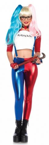 Misfit Hipster Costume includes a long sleeved crop top with hashtag accent and a pair of shiny red and blue leggings. Also included is pair of braces and a choker.
