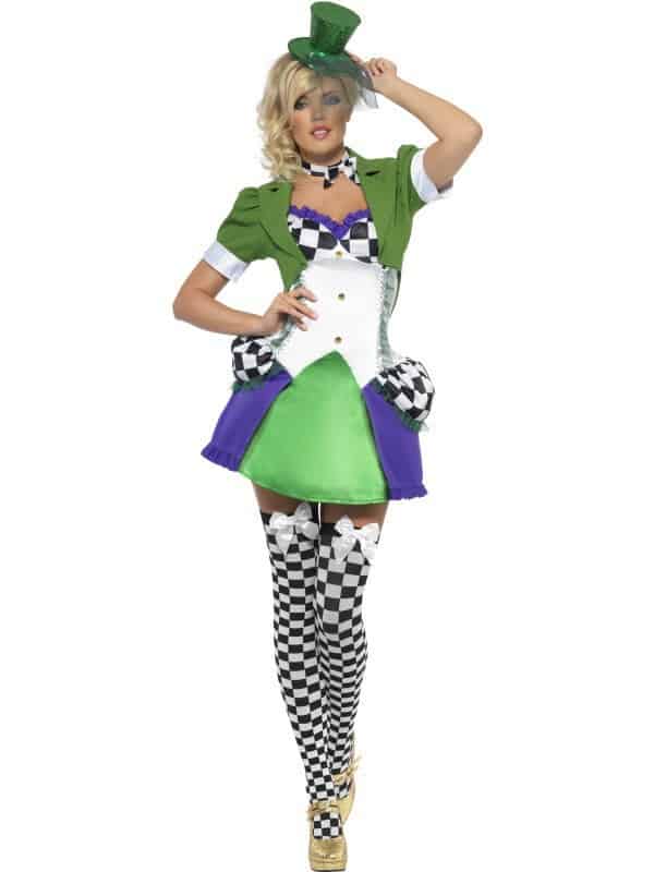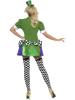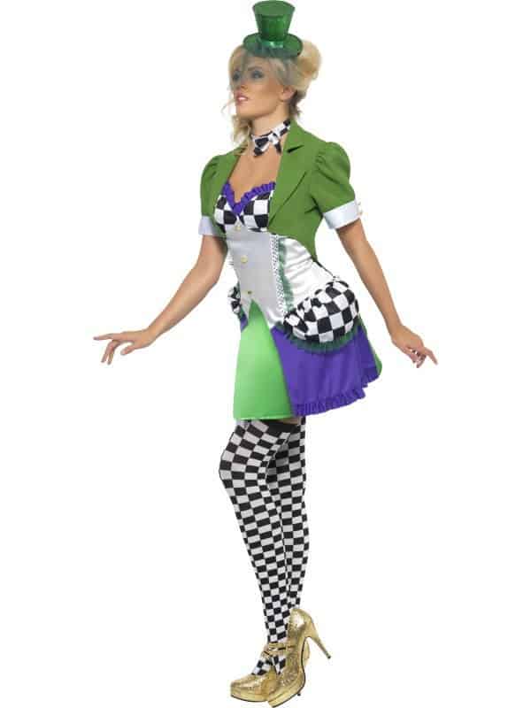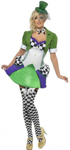 The costume includes a short purple and green dress with bold black and white checks, a green jacket and chequered neck tie.