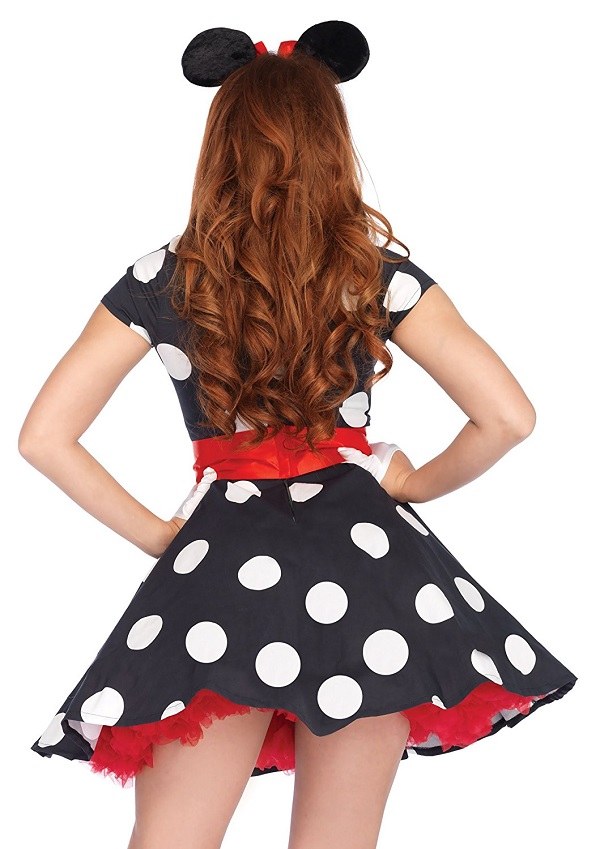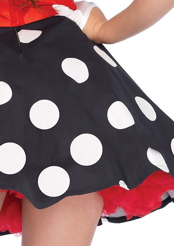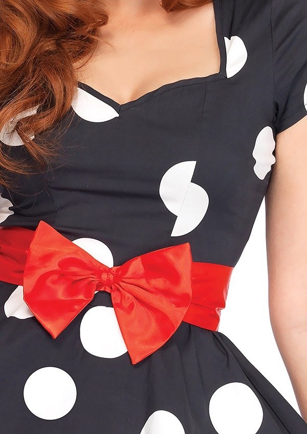Ladies Miss Mouse Costume includes a black and white polka dot dress with a red belt wit bow. To complete the look a matching headband with ears and bow is also included.