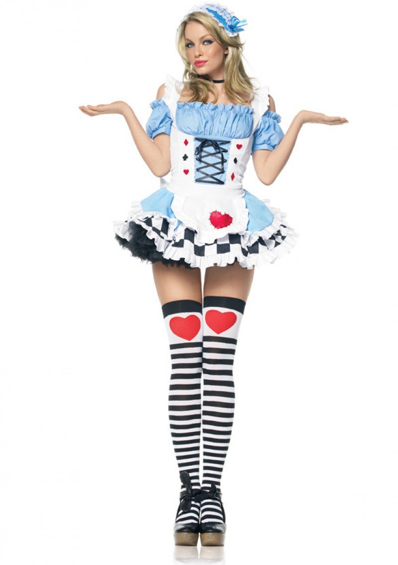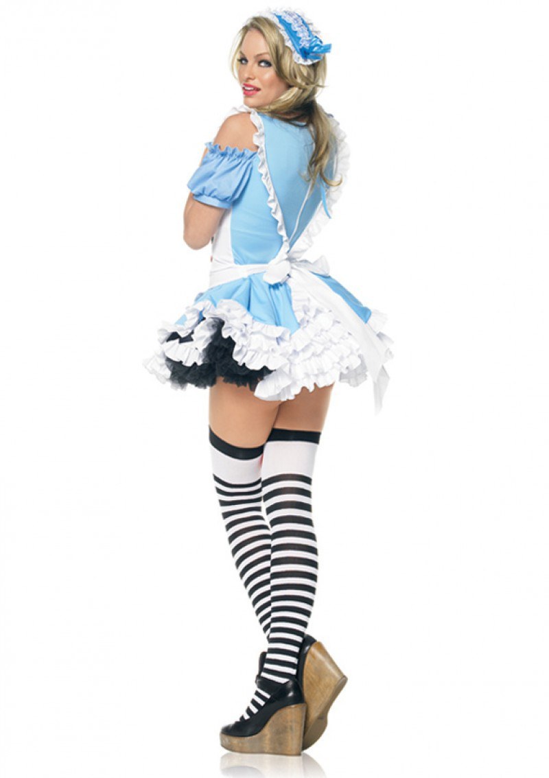 Miss Wonderland two piece costume consists of dress with attached apron and head piece.
