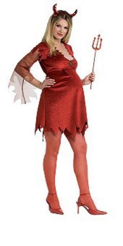 Mommy To Be Devil Lady costume includes a red velour dress with jagged ends and see through mesh sleeves. The dress also features a low neck line with attached brooch and a pair of devil horns on a headband.