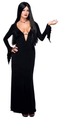 Morticia Addams costume includes a long black fitted dress with revealing low cut neckline, rhinestone detailing at the bosom and flared sleeves. To complete the look the waist length wig is also included.