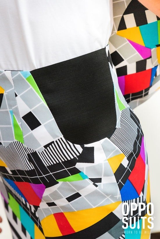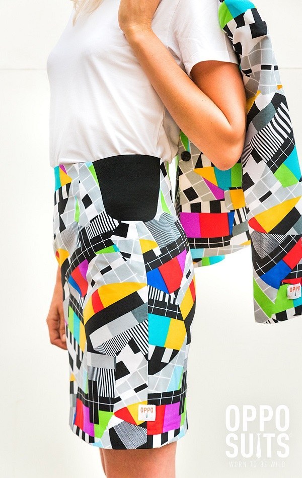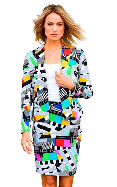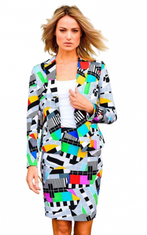 Ms Testival Suit includes a colourful test screen suit with matching long sleeved jacket and a skirt.