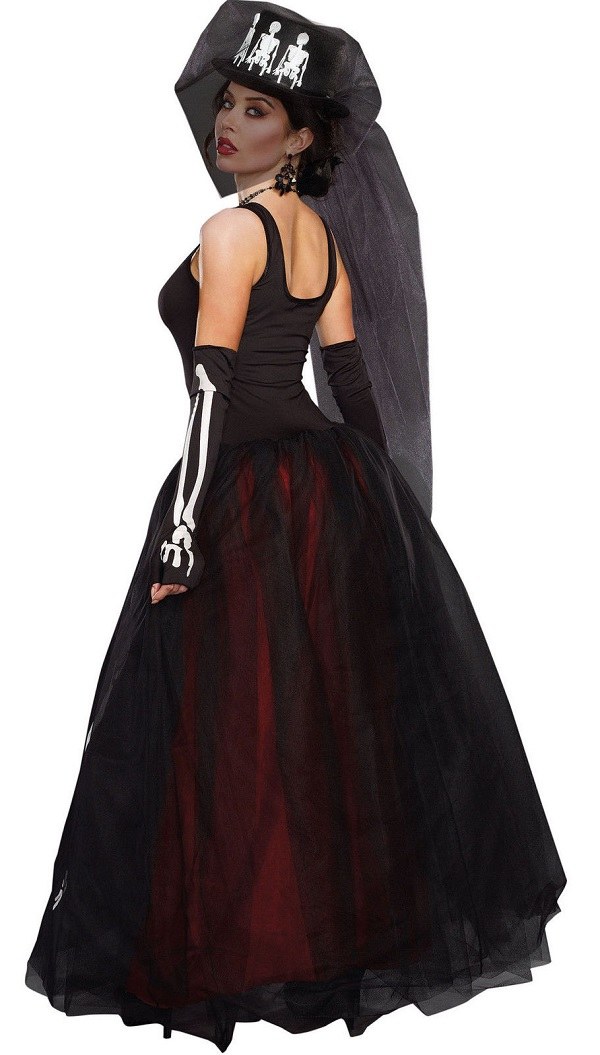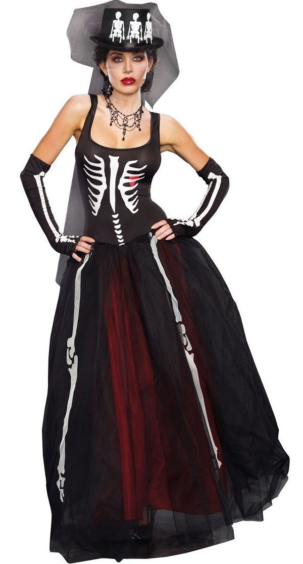 Ms. Bones Costume includes a long skeleton print dress with stretch bodice with an attached full layered tulle and a satin skirt. To complete the look a pair of skeleton screen print fingerless gloves are also included.