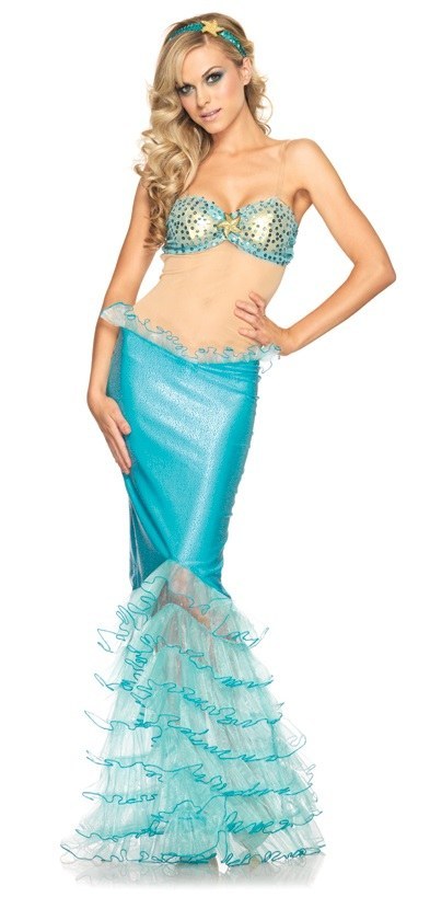 Mystical Mermaid Costume includes a sequin trimmed bubble print mermaid dress with a layered organza tail and a sheer torso. The dress also features detachable clear straps.