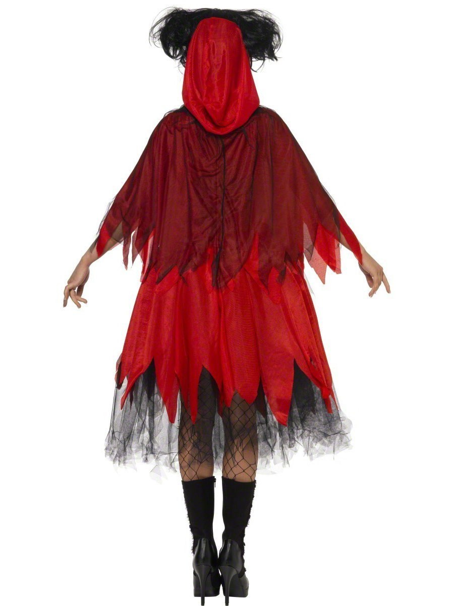 To complete the costume is the white apron with co-ordinating jagged ends and a red heart appliqué. The red cape and attached hood with black sheer overlay completes this costume to give it a very eerie feel.