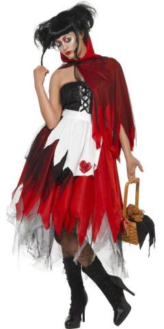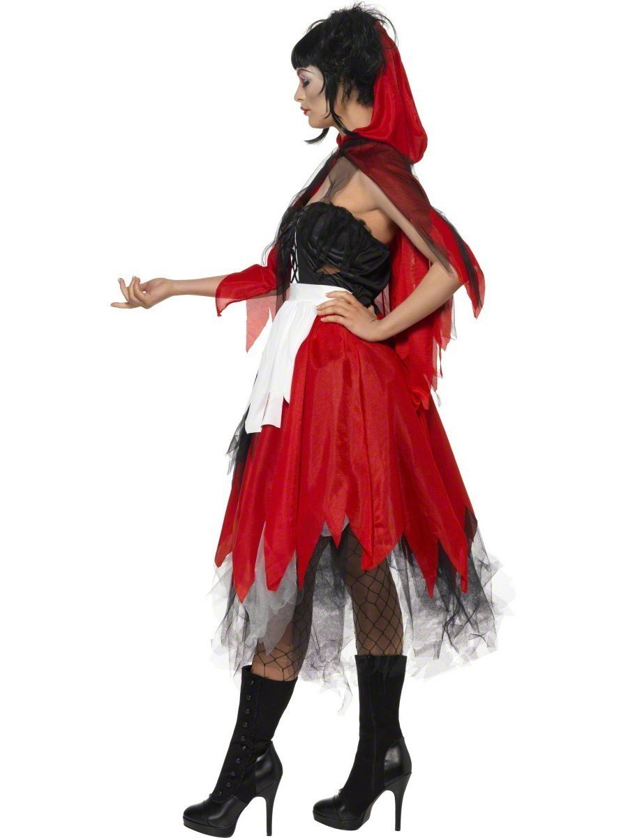 Our Naughty Biting Hood costume comes complete with red dress with sheer underlay which have jagged ends the dress also features black sheer overlay. The top of the dress is a black corset style top with ribbon tie to the front.