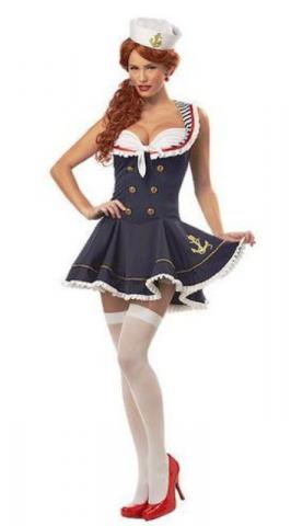 This deluxe costume is part of the Eye Candy collection. The Nautical Doll costume features a navy halter neck dress with a white frill collar with red trim, gold buttons decorate the front. The dress ties at the back with ribbon. The skirt of the dress has a gold embroidered anchor, gold braid trim and white pleated hem.
