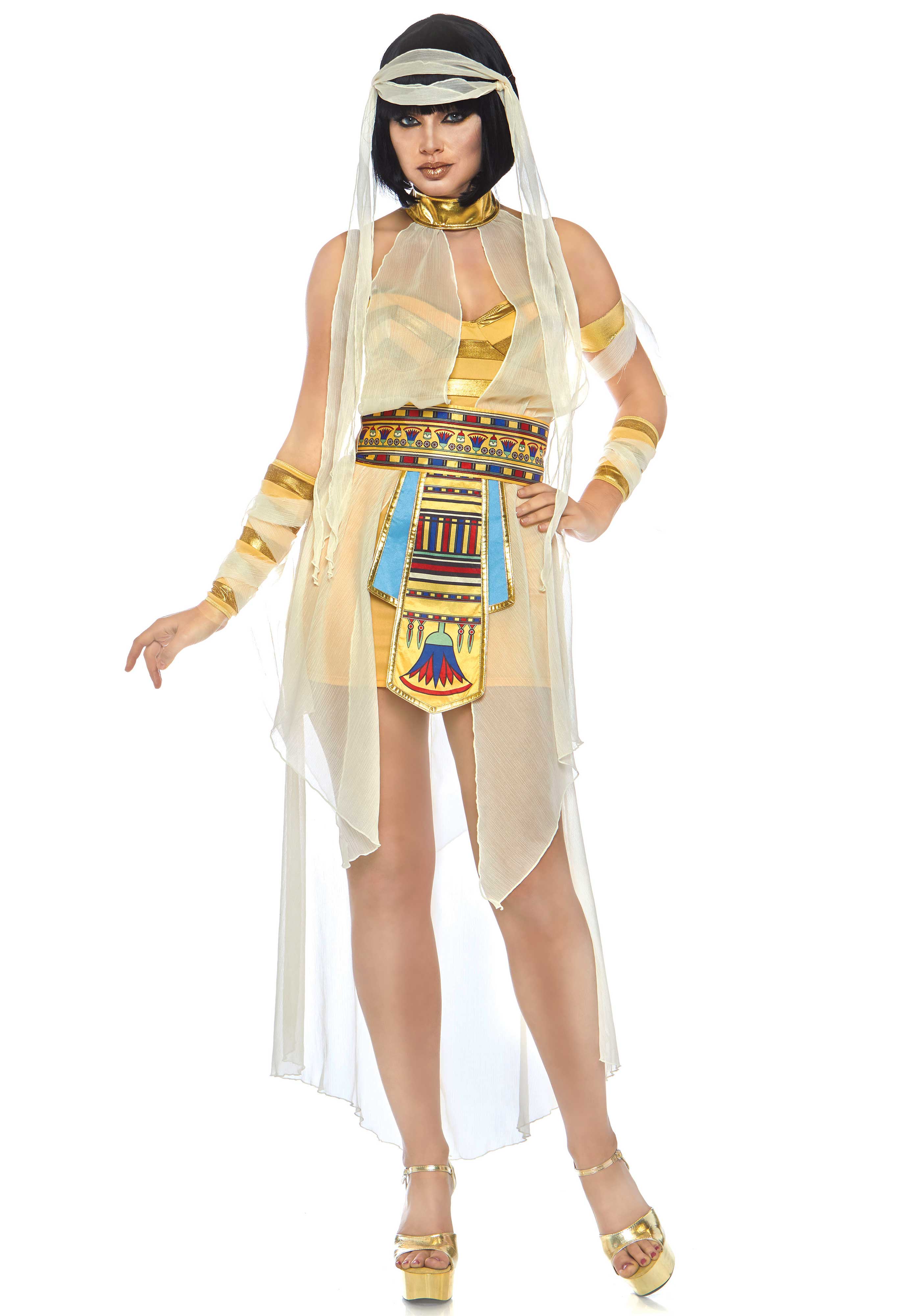 Cleopatra never looked better in the 6 piece Nile Mummy womens costume. This Halloween costume features a gold trimmed halter dress with removable clear straps and gauze accents, an ornate panel belt, gold wrist cuffs, gold arm cuffs, and a matching gauze head piece.