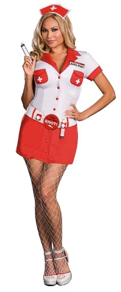 Nurse Anita Shot will cure anyone with this stretch knit snap front dress with red contrast collar and cuffs. All nurses need a stylish nurse's hat, white belt with red "Take your best shot" patch, 2 syringe shots and a removable "nurse Anita shot" name badge.