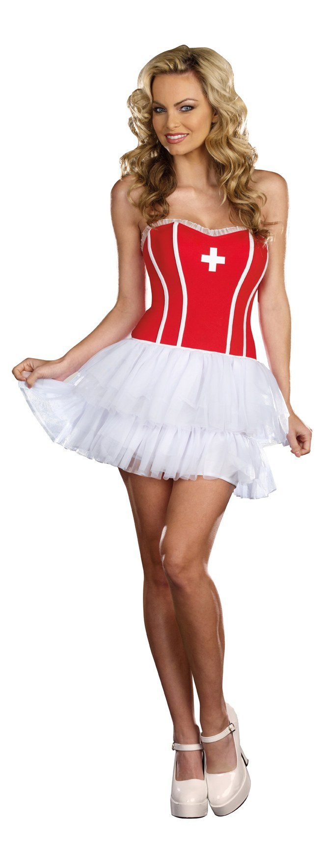 Fully boned red and white stretch knit corset with contrast boning detail and cross screen print.