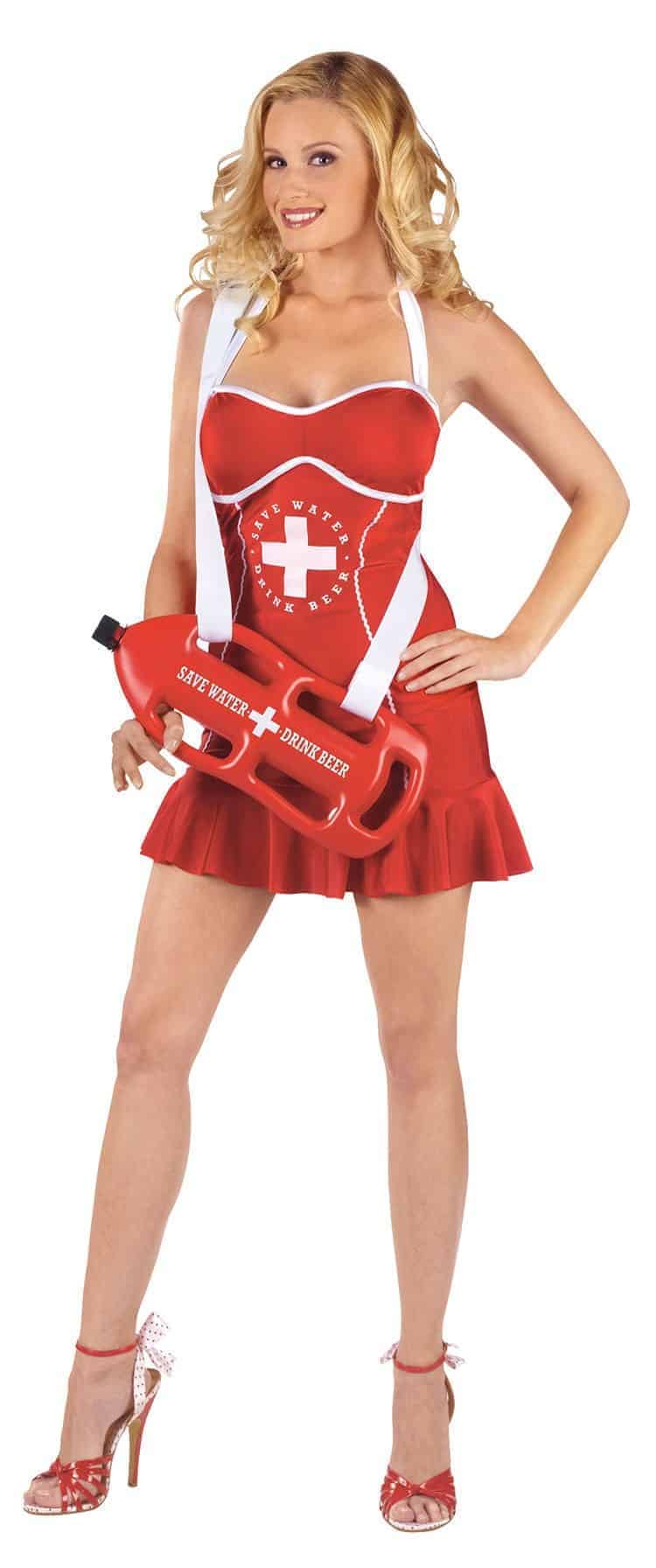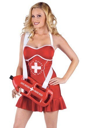 Off Duty Lifeguard Costume includes a cute red and white halter neck mini dress which features a screen printed logo which reads " Save water drink beer" around a white cross motif.
