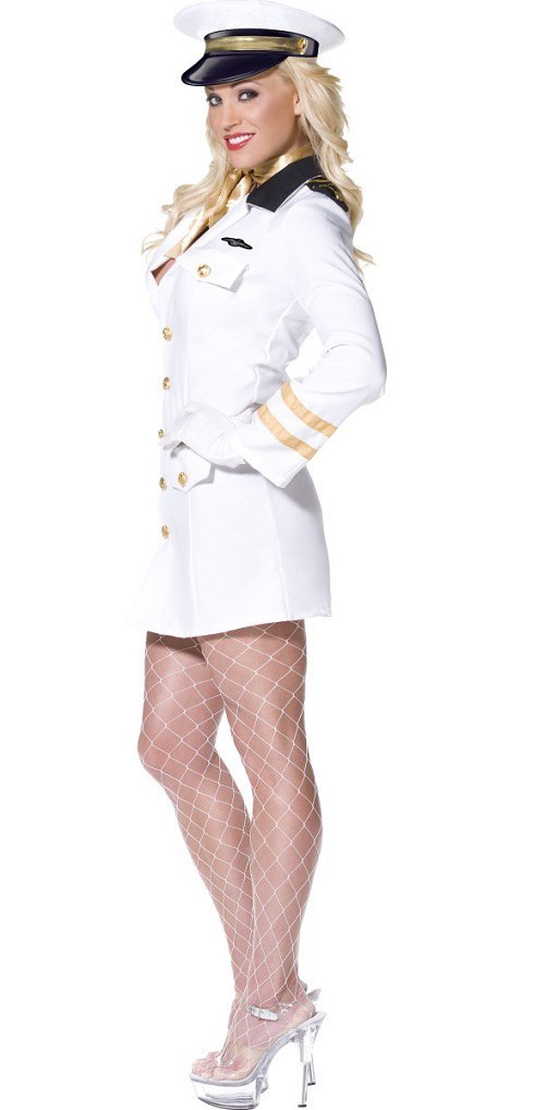 Ladies Officer costume includes a white long sleeved dress with button and pocket detailing. Also included is a pair of white hand gloves.