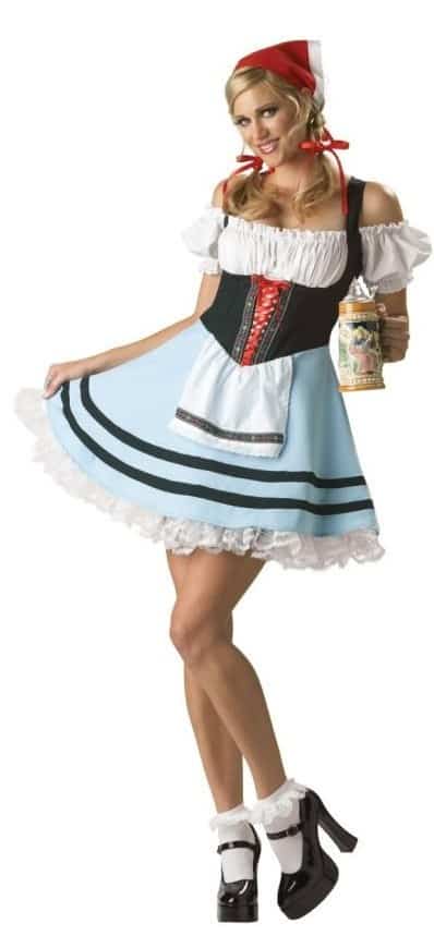 The pretty Oktoberfest Girl Costume includes an off the shoulder dress with blue full skirt. The front is laced with red ribbon and the skirt has navy ribbons and an attached white apron and an attached lace underskirt to give it shape.