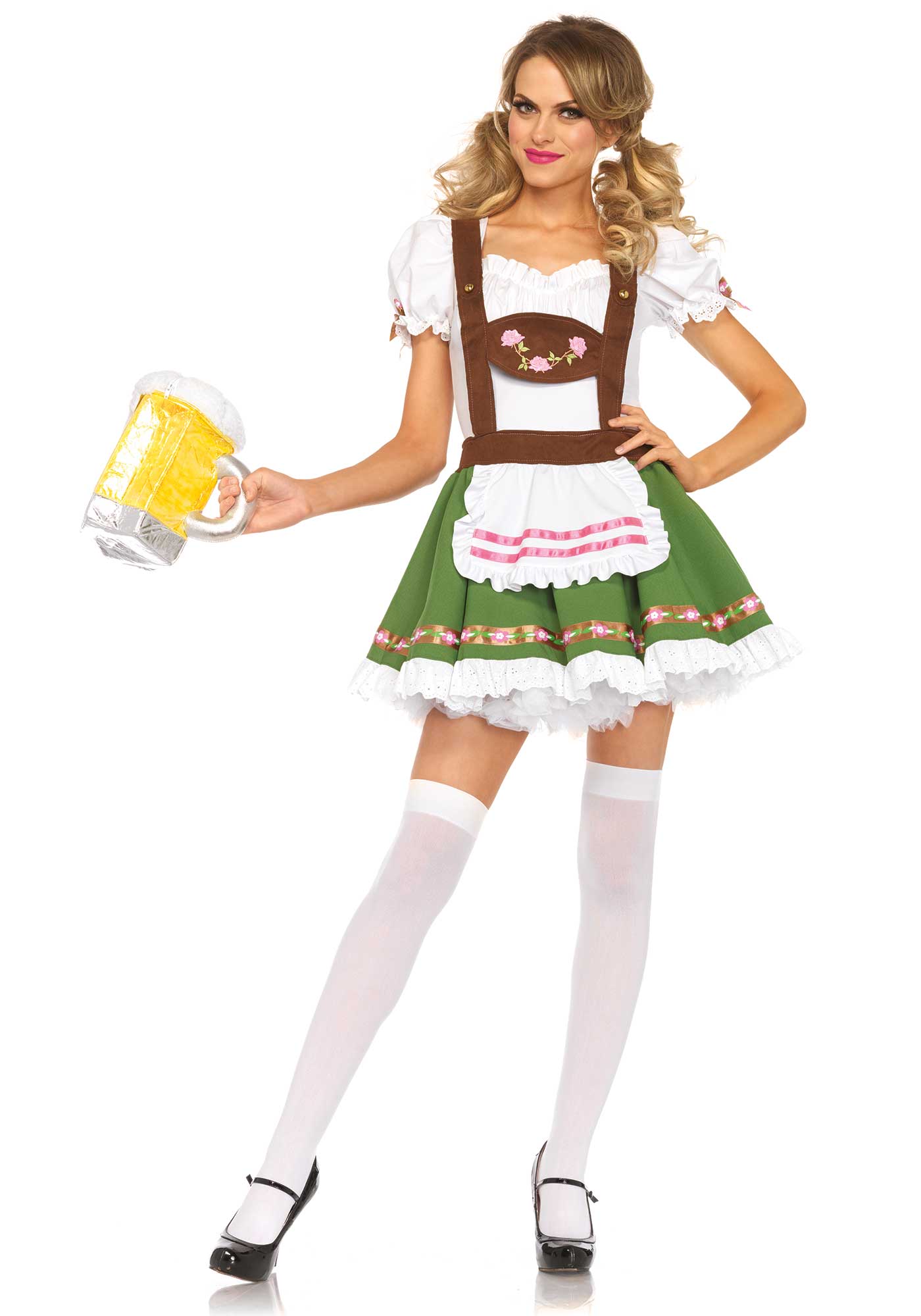 Oktoberberfest Sweetie Costume features ribbon trimmed peasant dress with ruffle apron and attached bib suspender. This Bavarian style outfit is perfect for any beer or German related event, not just Oktoberfest the german beer festival.
