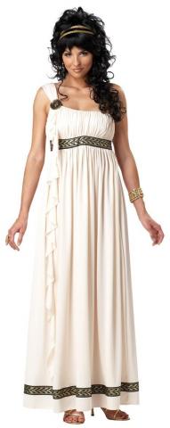 Graceful Olympic Goddess Costume consists of a white, ankle-length gown with beautiful gold detailing under the bust and at the hemline.