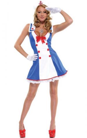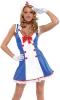 Our gorgeous Overboard Sailor Costume includes a blue and white sailor dress with red button detailing, printed red stars on the shoulders and a central red bow.