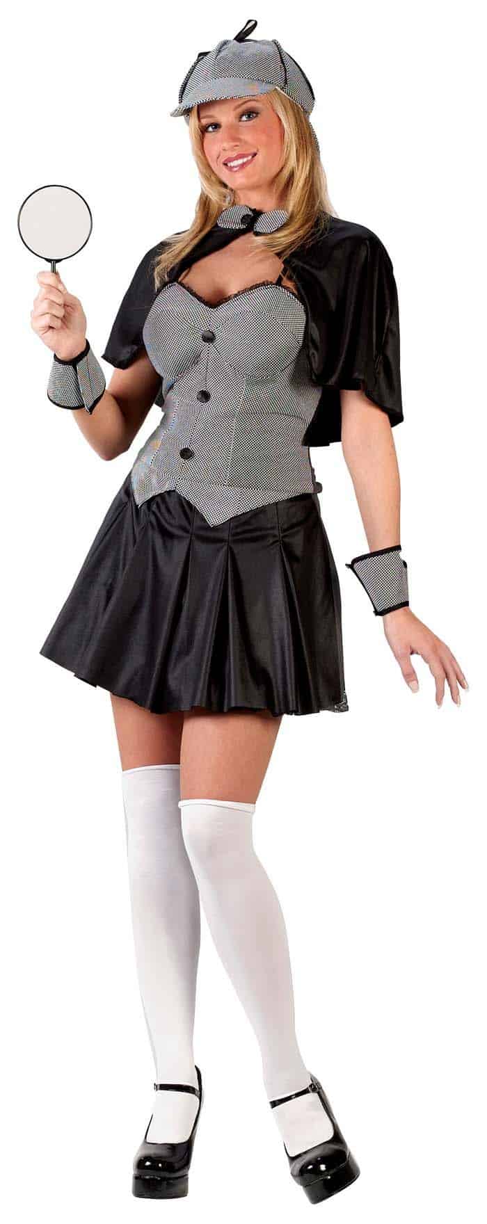 The Sexy Inspector Costume includes a black and grey plaid style top with attached black skirt, black cape with plaid tie, cuffs, and cap.