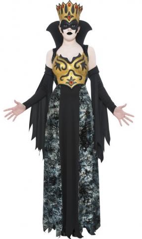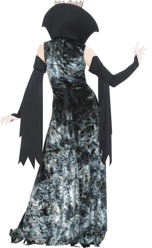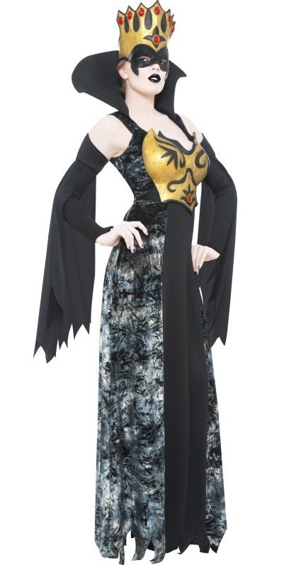 The Phantom Queen costume include a floor length dress with collar and a latex bodice. Costume also includes a pair of black sleeves and a crown with attached mask.
