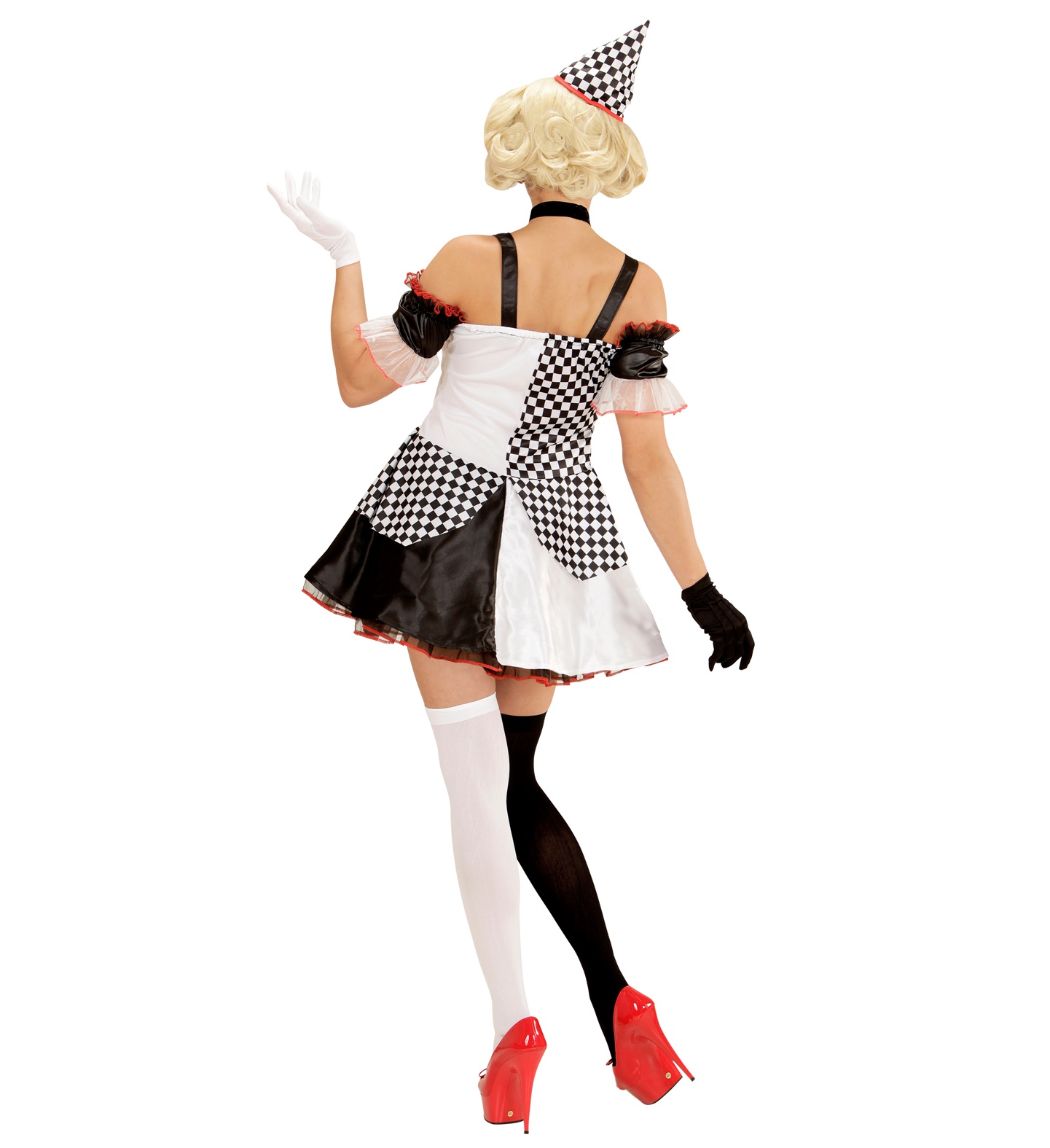 This costume includes a black, white and red dress with a matching hat to complete the look.