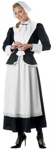 Ladies Pilgrim costume includes a long black and white dress with tie back bib collar, white cuffs and an attached white apron. To complete the look a white headpiece is also included.