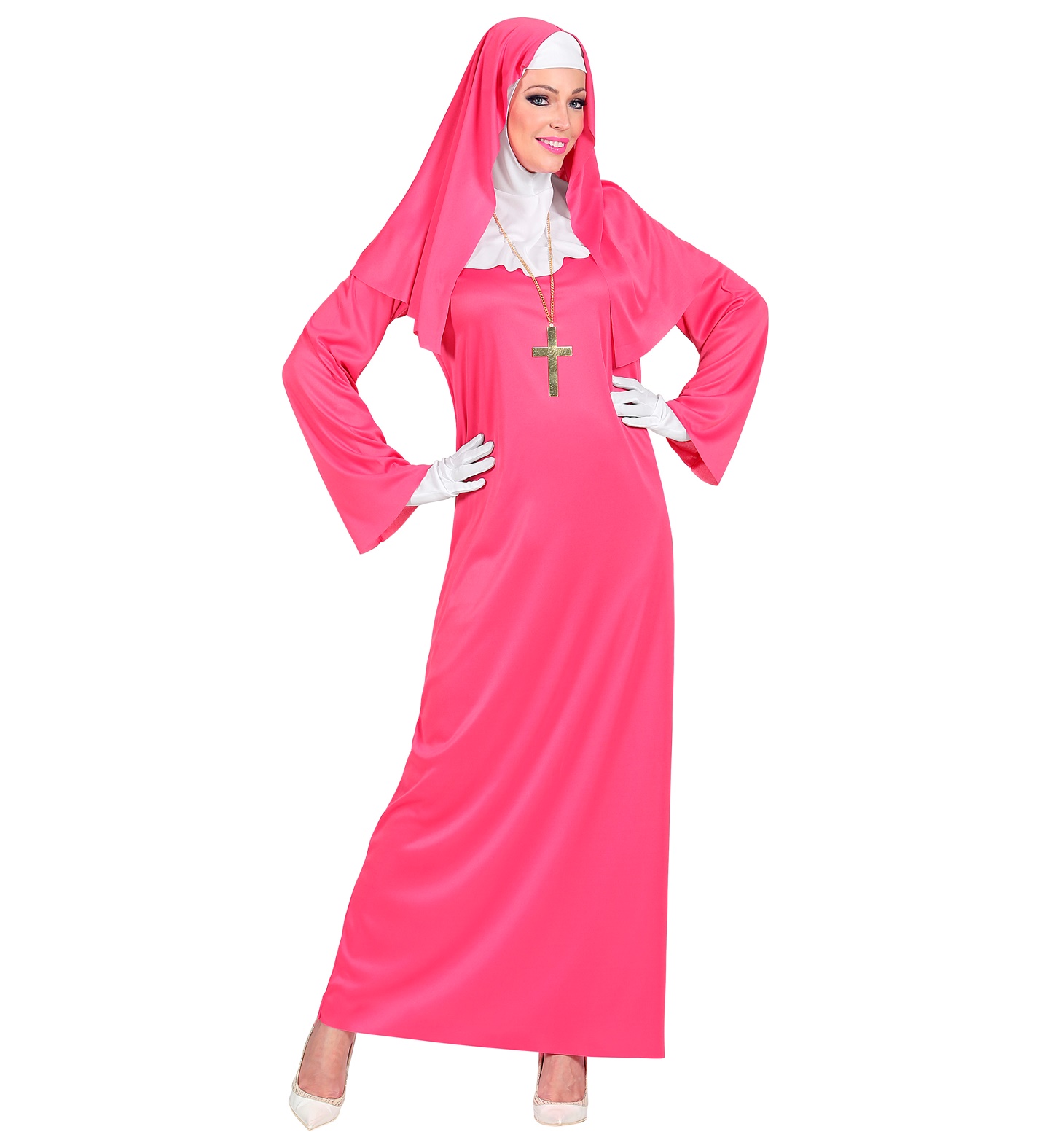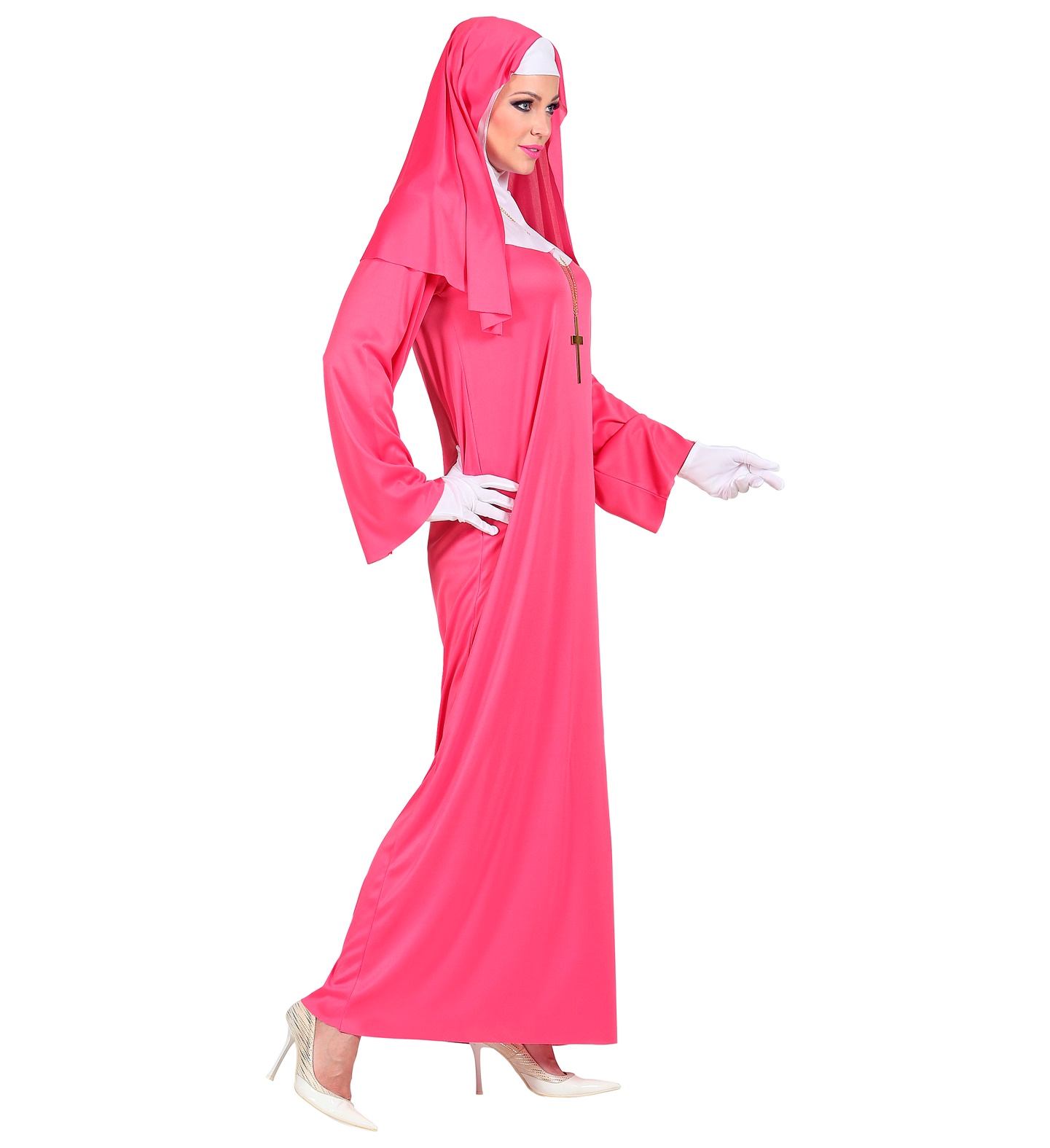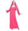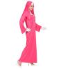 Pink Nun costume includes a long pink dress with white neckline and collar. To complete the look a pink and white wimple headpiece.