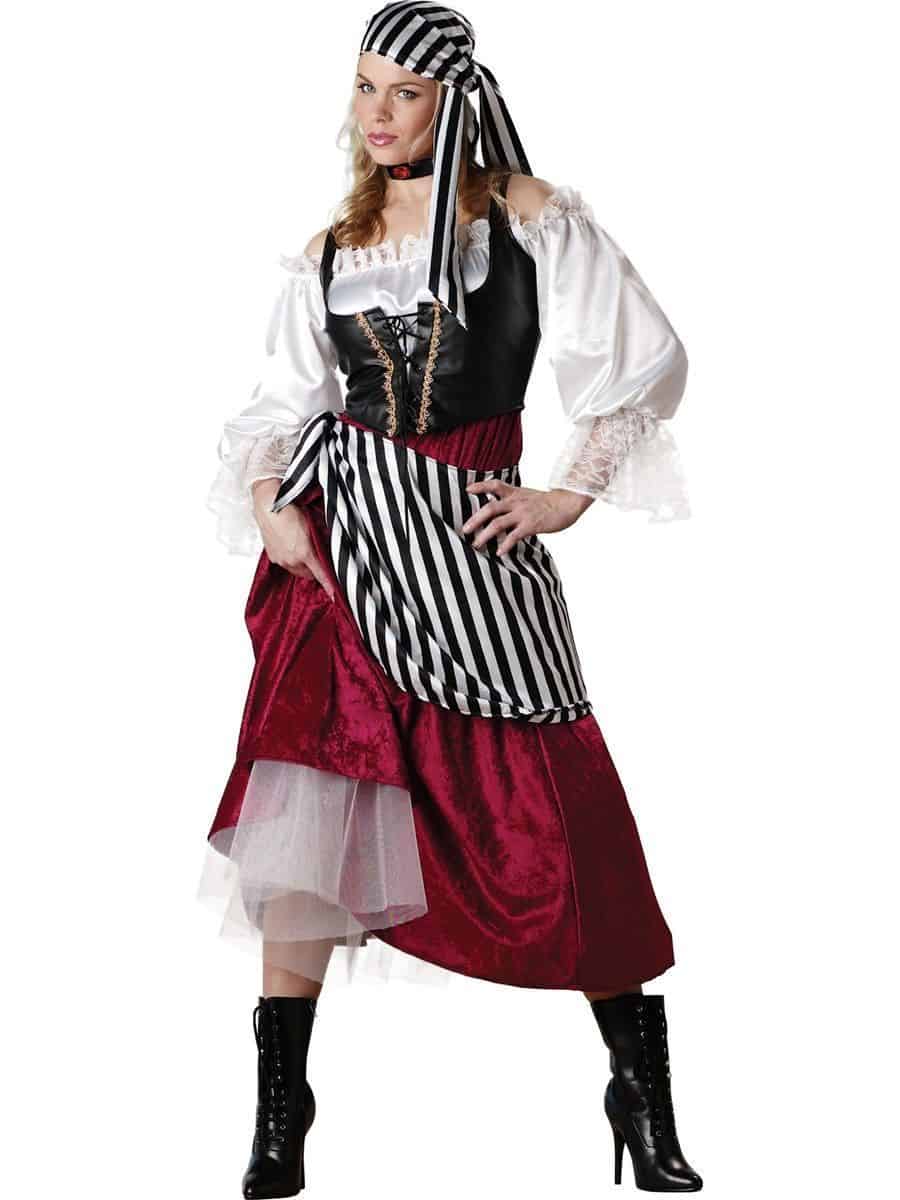This beautiful Pirate Wench Costume consists of a mid-length dress with gold trim lace up vinyl vest. Also included is a tulle petticoat, a sash and a bandana.