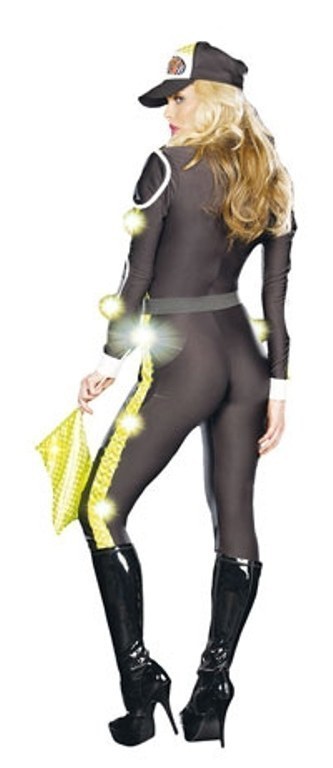 Pitstop Penny Costume includes a spandex zipper front catsuit with net sleeves. The catsuit also features a body harness belt.