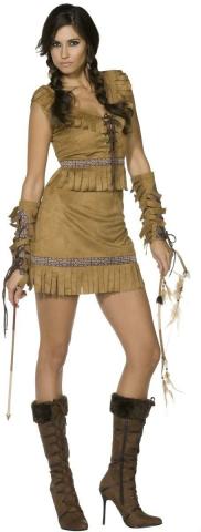Ladies Pocahontas costume includes a one piece fringe detailed brown dress with zip closure. Costume also includes a pair of fringe detailing arm cuffs.