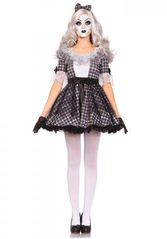 Pretty Porcelain Doll Costume includes lace trimmed dress with bow accents, matching bow headband, and creepy doll face mask. The pantyhose, wig and gloves can be purchased separately on our site.