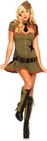 Private Pin Up costume includes a khaki green front zipper dress and ribbon detail along the trim. Also included in this costume is a co-ordinating shrug with an attached tie and a black belt. To complete this military look a army hat is also included.