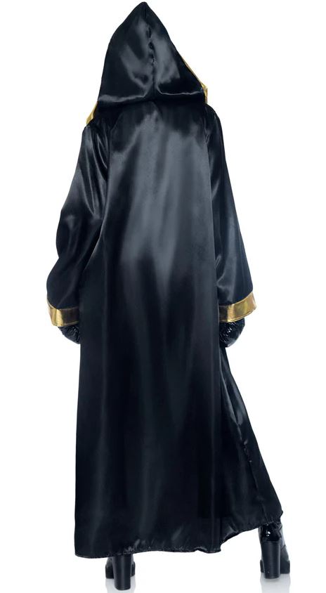This five-piece set includes a metallic bandeau top, high-waisted shorts with an elastic waistband, a satin hooded robe, a champion belt, and vinyl boxing gloves.