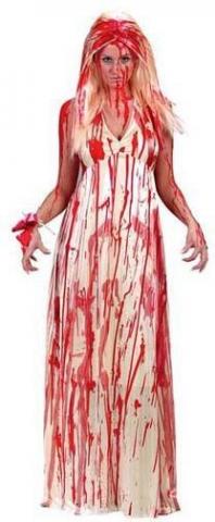 The Prom Queen costume features a cream floor- length gown with blood splatter pattern.