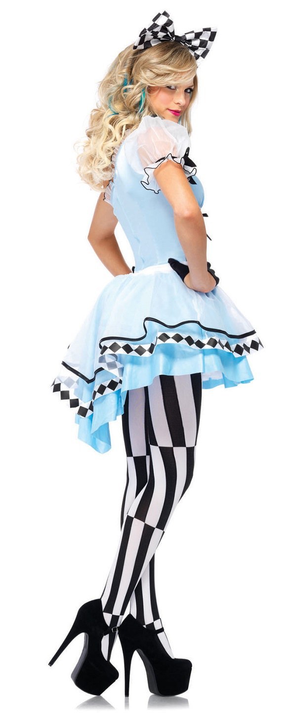 Take a wild ride down the rabbit hole in the 3 Piece Psychedelic Alice costume. This wonderland Halloween costume includes an asymmetrical high/low Alice dress with a layered skirt and lace up waist detail, attached monogramed apron, collar choker, and an oversized bow headband.