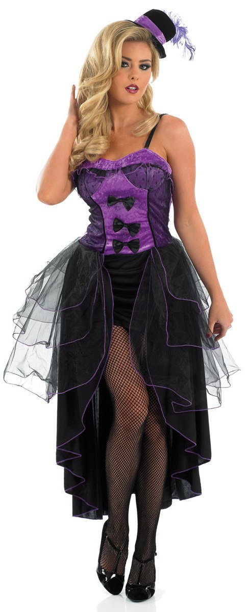 Sexy, sassy, bright and fun; this Purple Burlesque Costume for ladies demands all eyes on you! This costume includes a purple and black dress with frills and bows, black sleevelets and a neat little feather hat.
