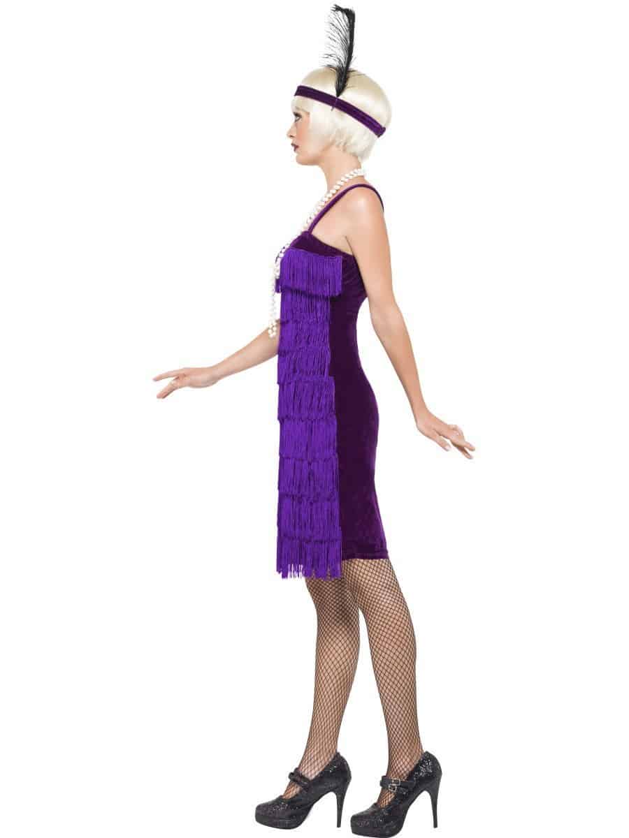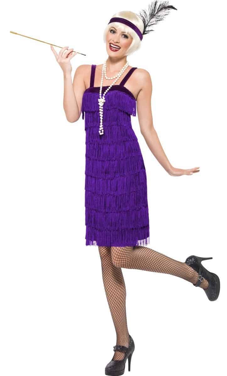 Jazz Flapper costume includes a knee length purple fringe dress. To complete the twenties look a purple headband with black feather is also included.