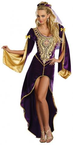 This costume consists of a elegant purple high low dress with gold detailing on the front panel of the dress which continues down the hem of the dress, the open sleeves of the dress are lined with gold. The dress also features gold bows on the shoulders.