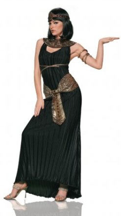 Queen of the Nile costume includes a long black soft pleated halterneck dress which is backless, with a gold look rope detail which crosses around front of waist and ties to the back. Also includes sequinned collar, belt, jewelled headband and to finish off the look, a gold look snake shaped armband.