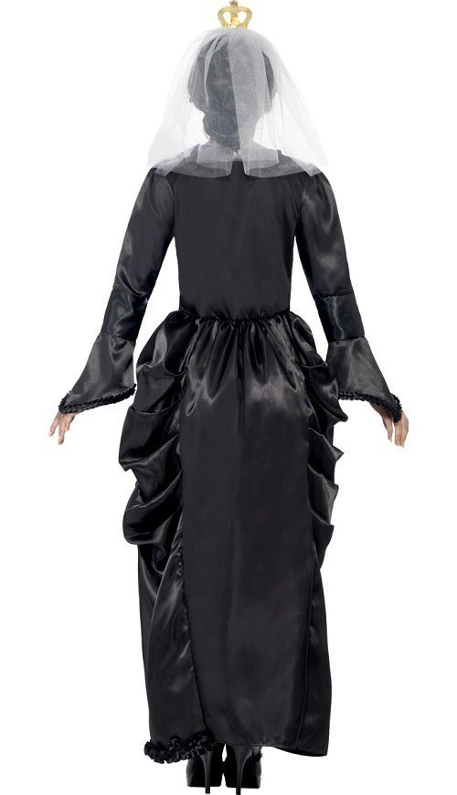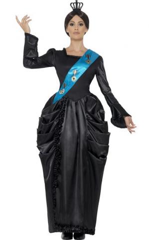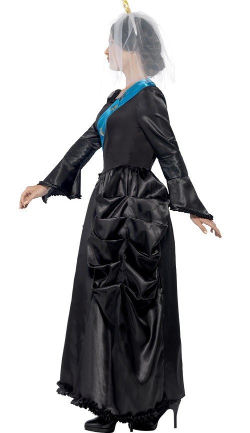 Deluxe Queen Victoria Costume includes a long black dress with an attached blue sash with printed medals. To complete the look a headpiece is also included.