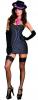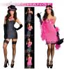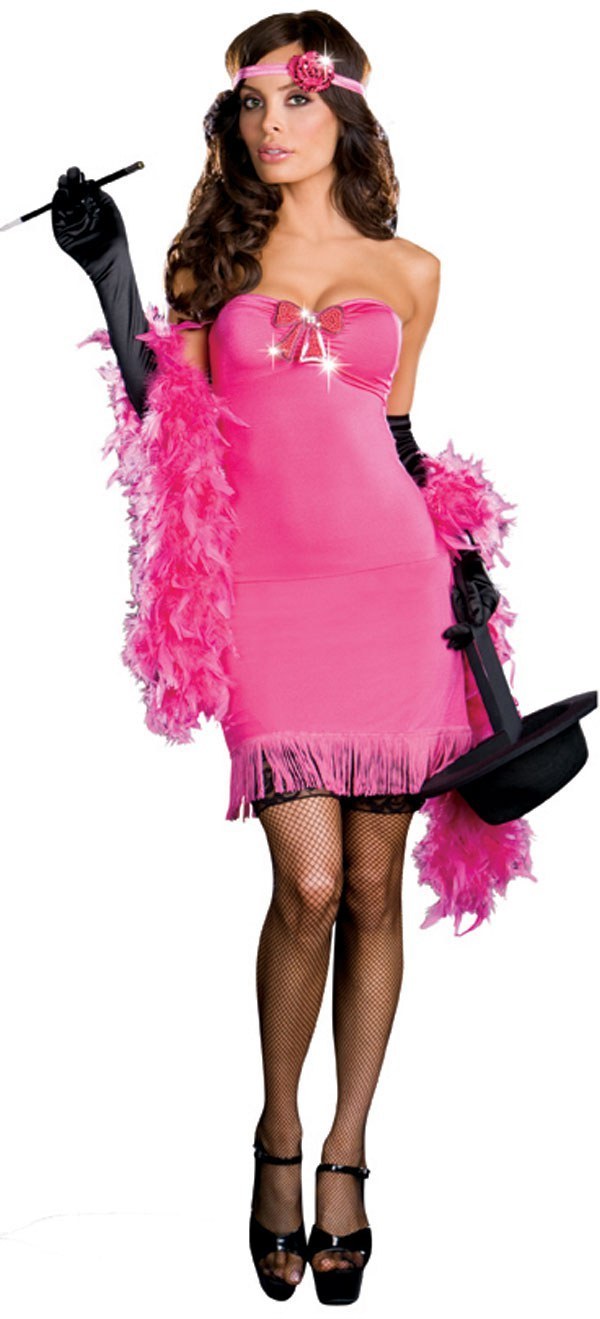 The gangster dress is a pinstripe micro-fiber mini that includes a black Fedora hat with rose trimmed band and pink dollar neck tie. The pink micro-fiber flapper dress is fringed at the hemline and includes the interchangeable rose trimmed headband, and pink pearl bow pin with sequins.