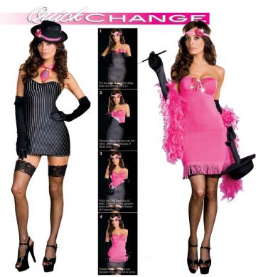 Go from Gangster to Gorgeous in a snap! This quick change double layer costume goes from gangster to flapper in just seconds, dress as a flapper and have a quick change to a gangster without even having to change your outfit.