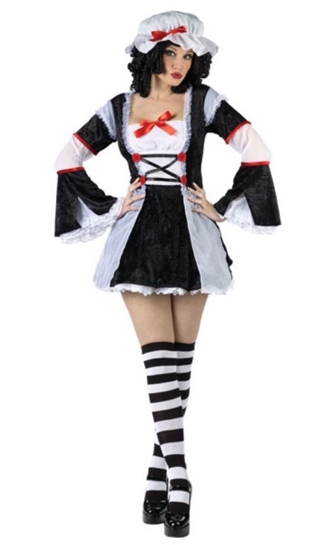 Rag Darlin costume consists of a velour and crinkle accent red, white and black with layered bell sleeves. Also included is a matching mop hat.